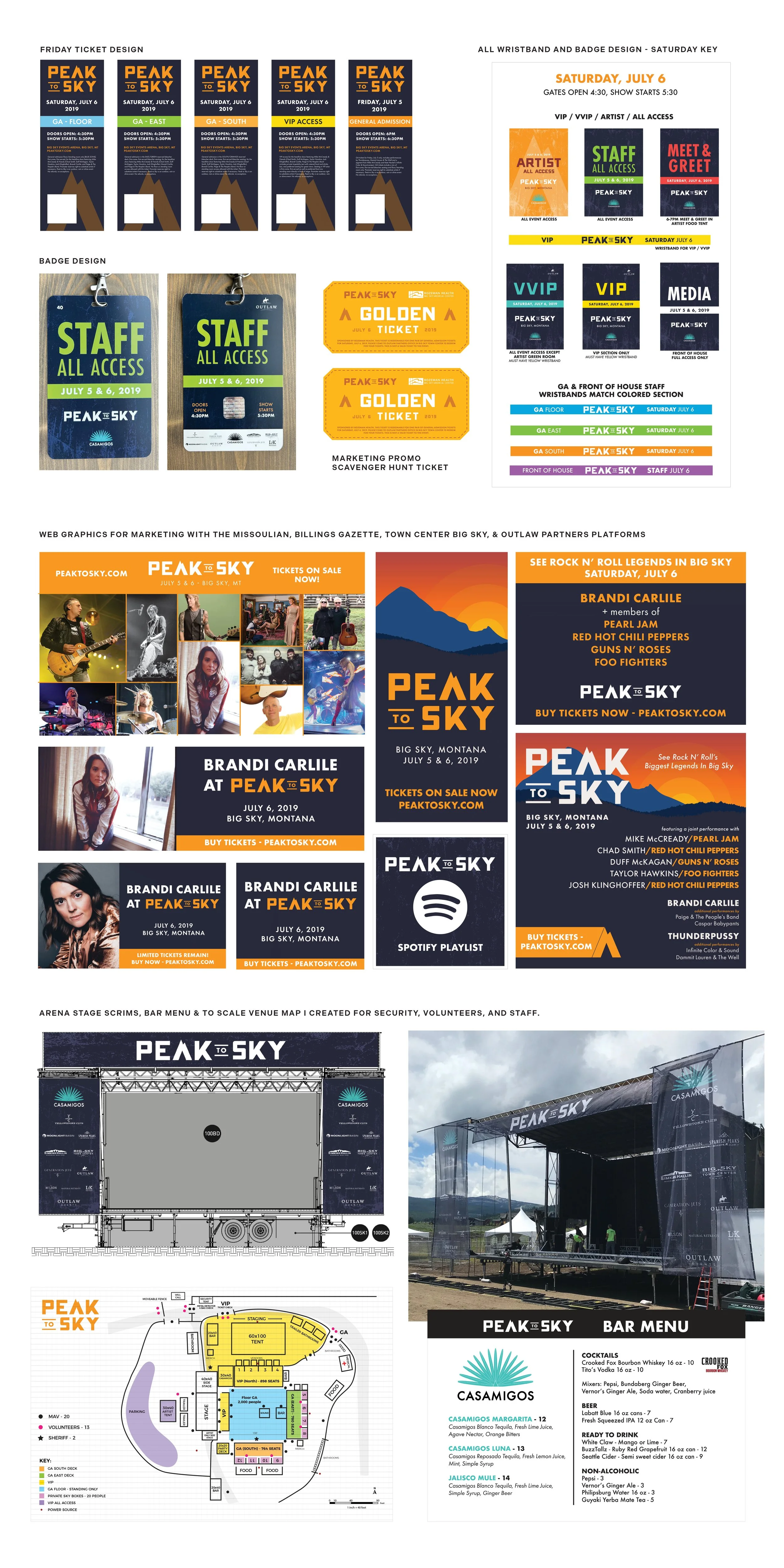 This project stands out as one of the most unforgettable and collateral-intensive endeavors I've been involved with during my tenure at Outlaw Partners. Our team was responsible for conceiving and executing 'Peak to Sky,' a remarkable two-day event curated by Mike McCready from Pearl Jam. Working closely with McCready's management team, we meticulously branded and marketed this event, producing all the necessary materials to successfully execute an event of this magnitude in Big Sky, MT from the ground up. All assets produced required immense attention to detail, and needed to be approved by all artists management teams.